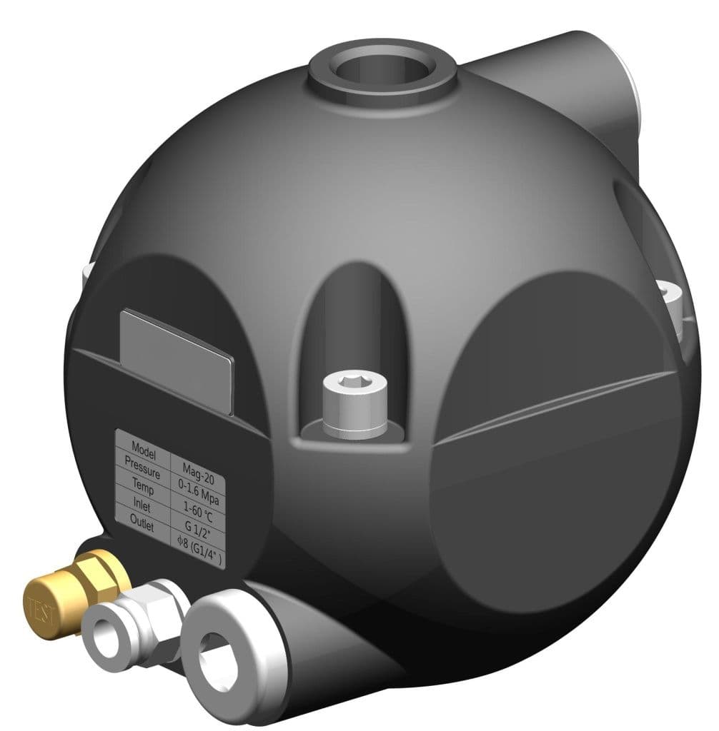 Осуществляет пневматическое регулирование в соответствии с изменением уровня с помощью специально разработанного магнитного поплавкового шарика и автоматически отводит конденсат через пневматический главный сливной клапан.
